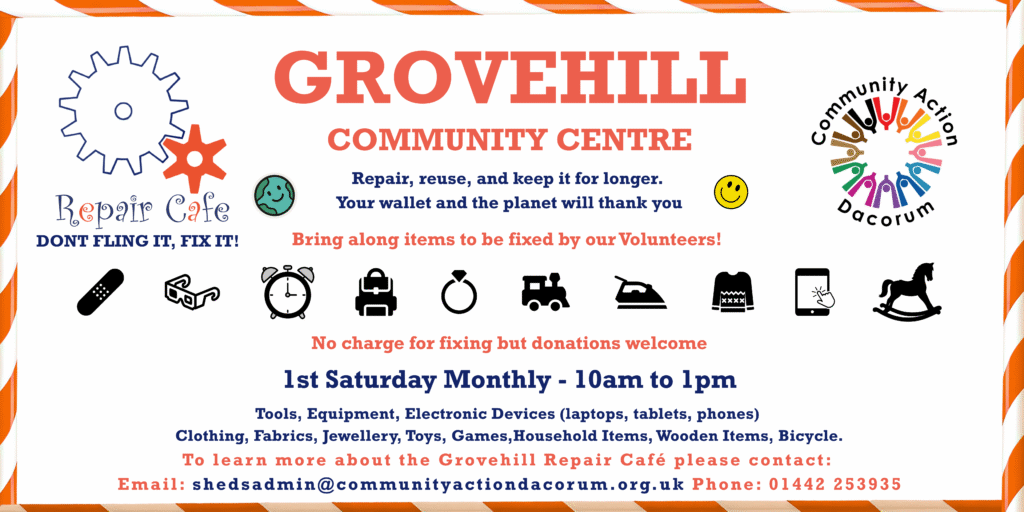 Grovehill Repair Cafe📍 C/O Grovehill Community Centre, behind Henry Wells Square, Hemel Hempstead HP2 6BJ